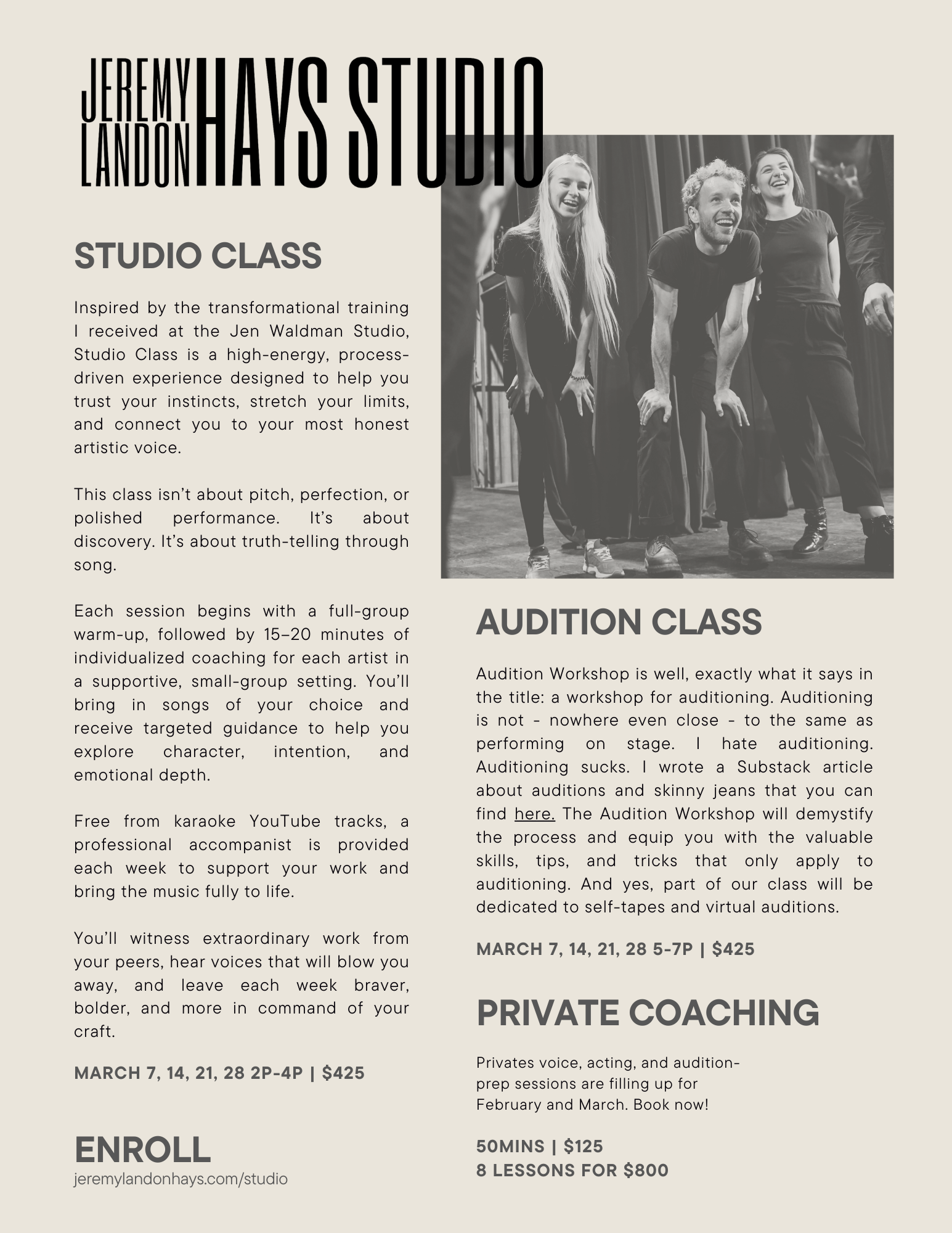“Jeremy Landon Hays Studio taught me more in six months than I learned in 4 years at school. Anyone can teach technique, but not everyone can teach you how to be the best version of yourself. JLHS has taught me that my self-perceived weaknesses are not actually weaknesses, they are uniquenesses that need honing. I never thought that playing to my “weaknesses” would become my biggest strength, but since coming to JLHS it is what has brought me the most success.” - Megan M.